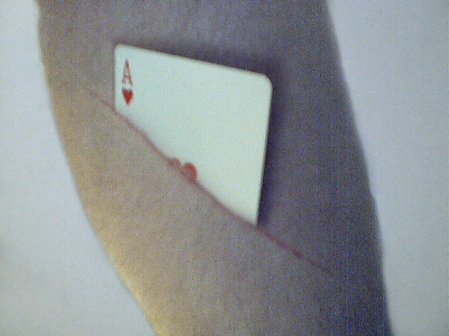The Trick This trick requires a little pre-show preparation. The magician should make a long cut in the back of one of his pants leg. Next, he should make a similar cut in his leg and slide an extra card (with a back identical to another pack of cards) under the skin. Like most good magic tricks, the prepatory step will take some practice, but after a few times it will become quite easy. The picture shows what this should look like. |