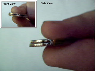 The Trick This is one of my favorite tricks; it can be performed in a little impromptu close-up magic show. The magician's hands really are empty and nothing is up his sleeve. He gets a quarter from an audience member and places it under a scarf. Now comes the magic (or trick, depending on who's watching!). While the quarter is covered, the magician folds the coin in half while distracting the audience with his magic words and flamboyant gesturing of his free hand. The coin should look like this: |